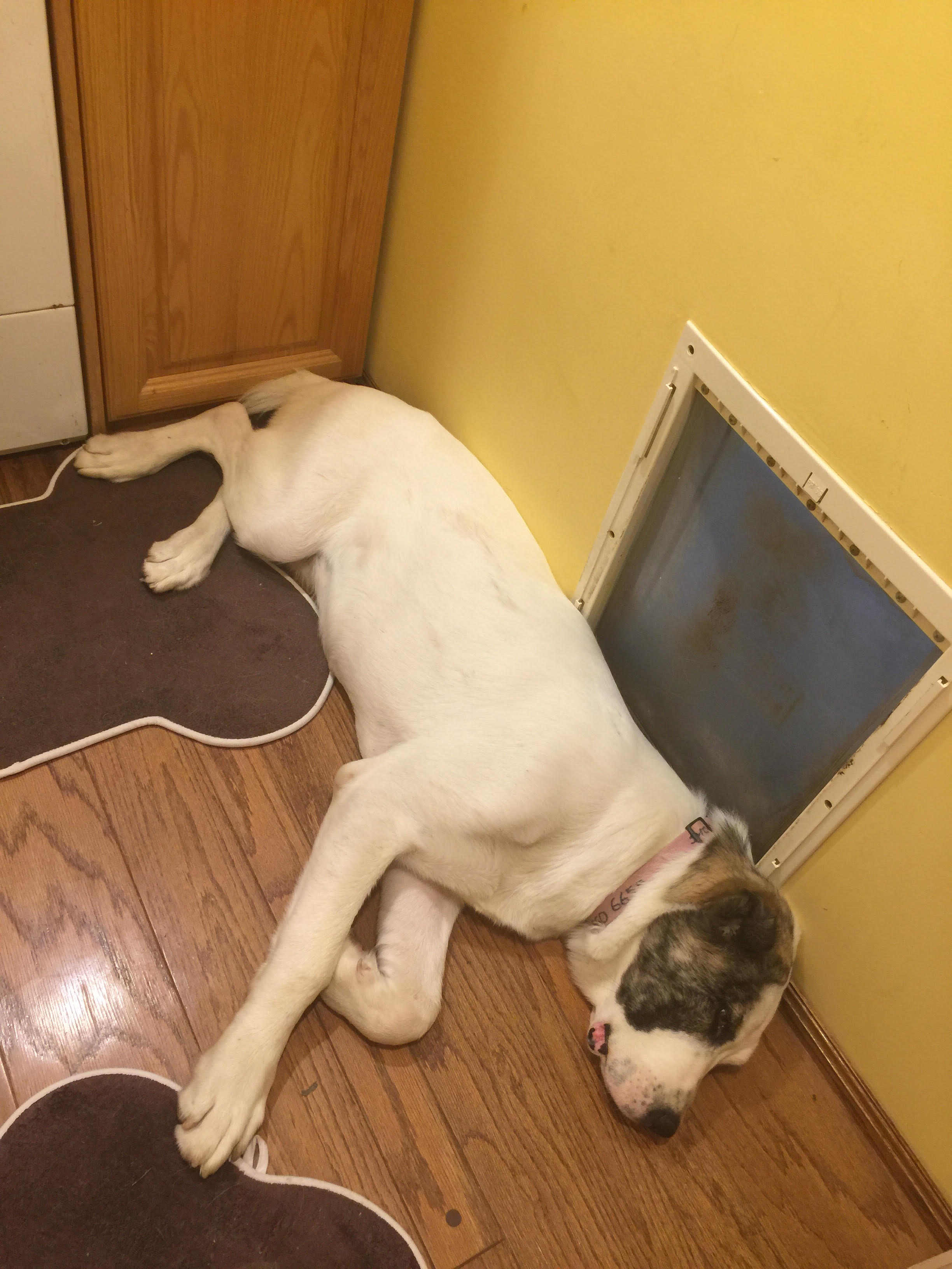 Here she is – and then she poked her head out of the doggie door to check if I was really going to take her for a walk or was just going outside myself. As you can see she has the intelligent eyes of a human. One smart dog ( I call her my horsie dog as she is truly enormous….and growing!)