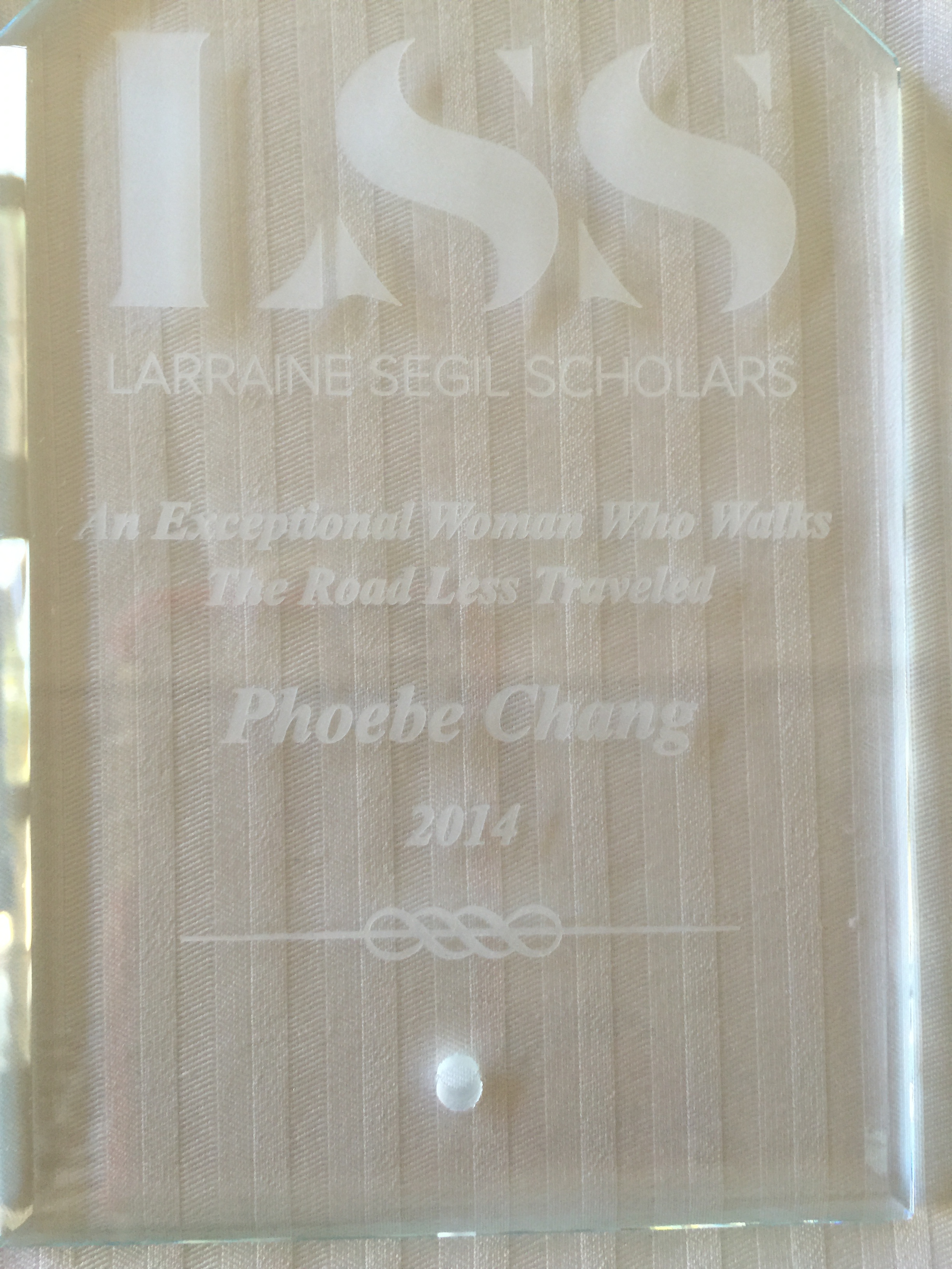 Here are some of our LSS group – they inspire me! And our dinner to celebrate! And we gave out Plaques to those in attendance with the LSS logo designed by our very own Esme Williams-Berenc – here is the plaque for one of our scholars with the year in which she became a member of LSS.acrylic-lss-award-example-phoebe-chang