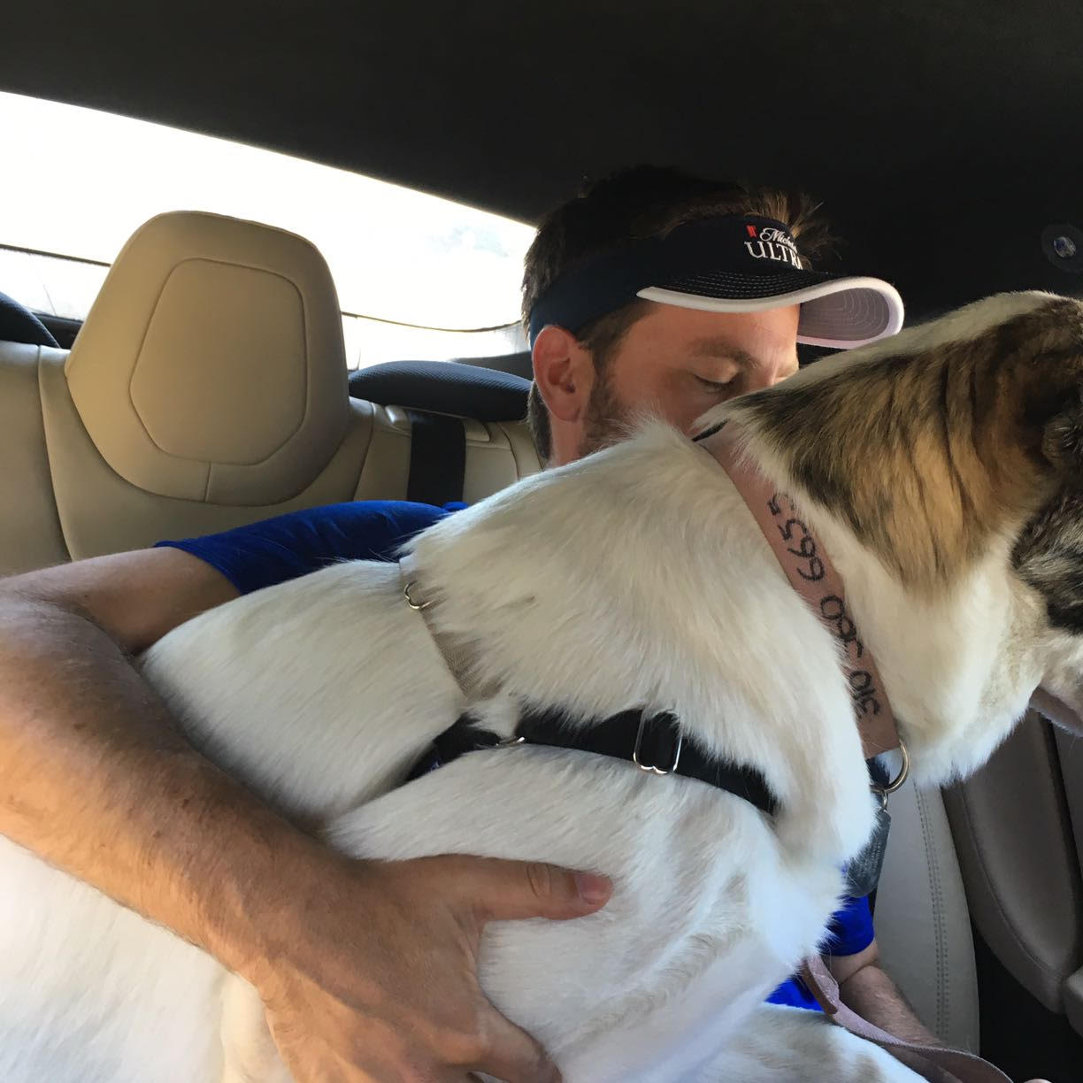 Our puppy (now about 110 lbs) is quite a car full. Here she is in the back of my car with our son – not much room for either of them! Of course once we got to the park she was a happy puppy!! So good with kids and other dogs – getting BIGGER EVERY DAY~! She does not eat much certainly not as much as you would think – just 4 cans of kibble (2 twice a day).