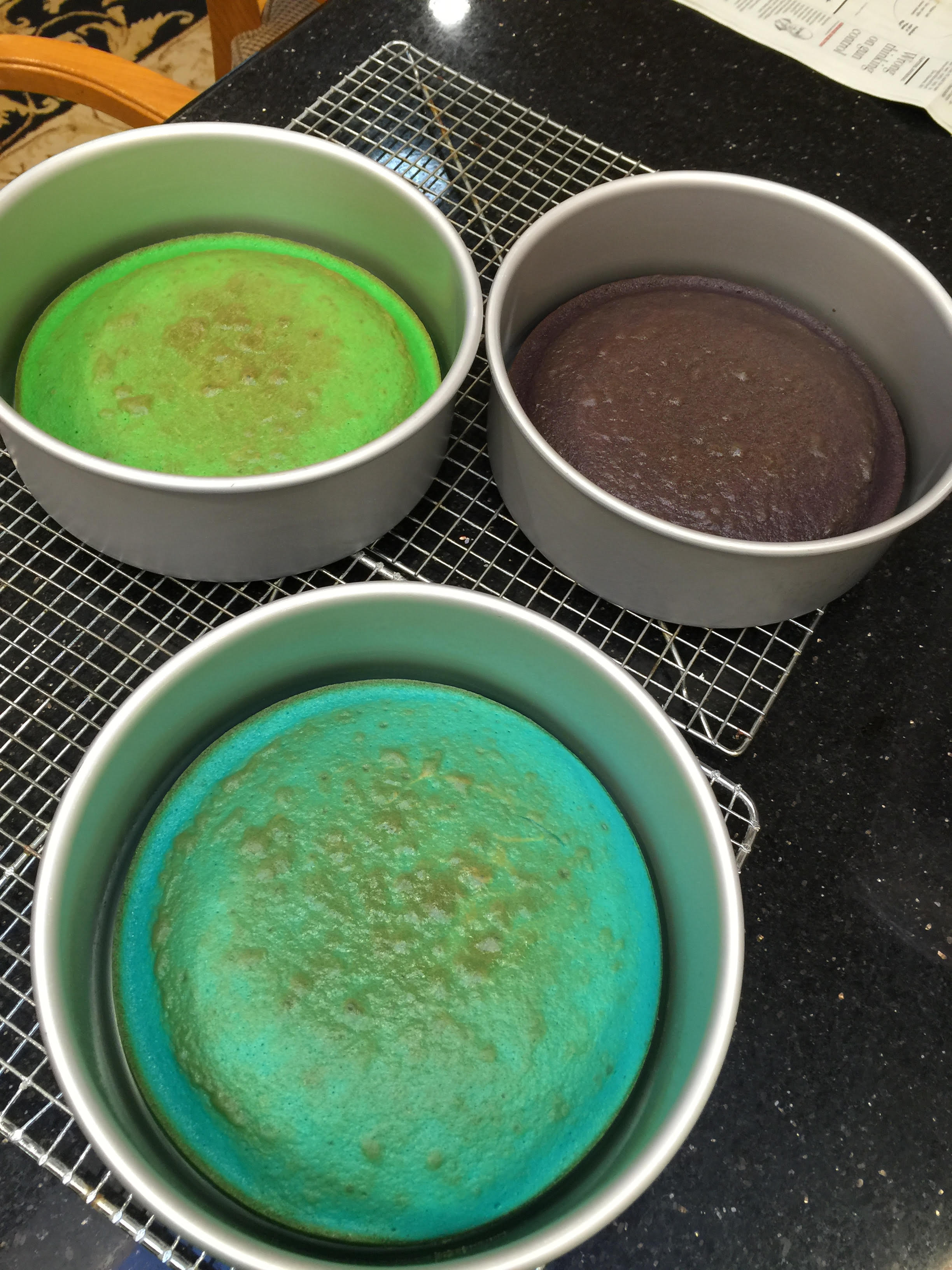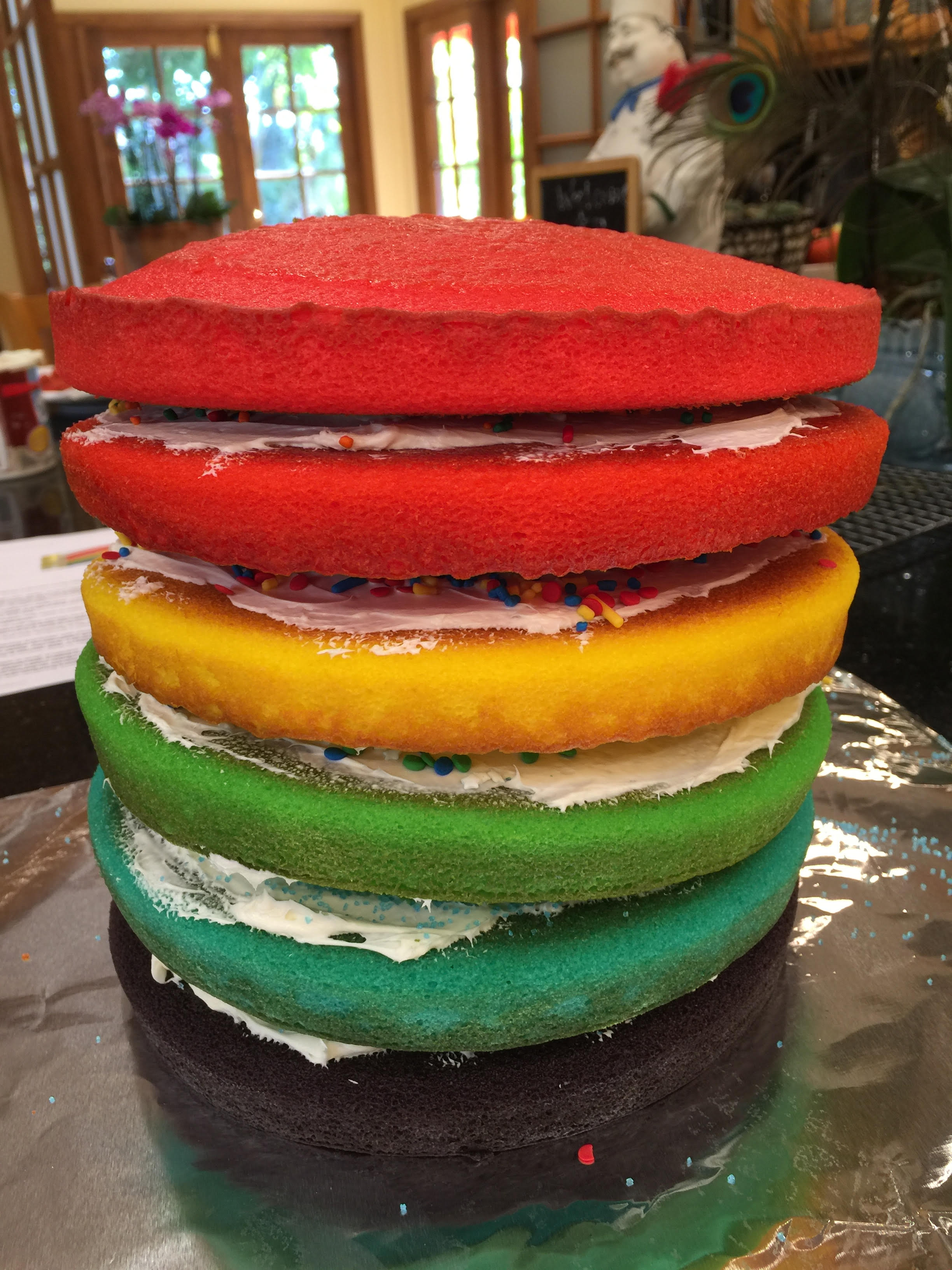 Jonah Rainbow cakes unfrosted 6 layers in cake pans 2016 7th bdat Before frosting – layers of vanilla frosting with sprinkles on them ( The second cake had alternate chocolate and vanilla frosting with sprinkles)