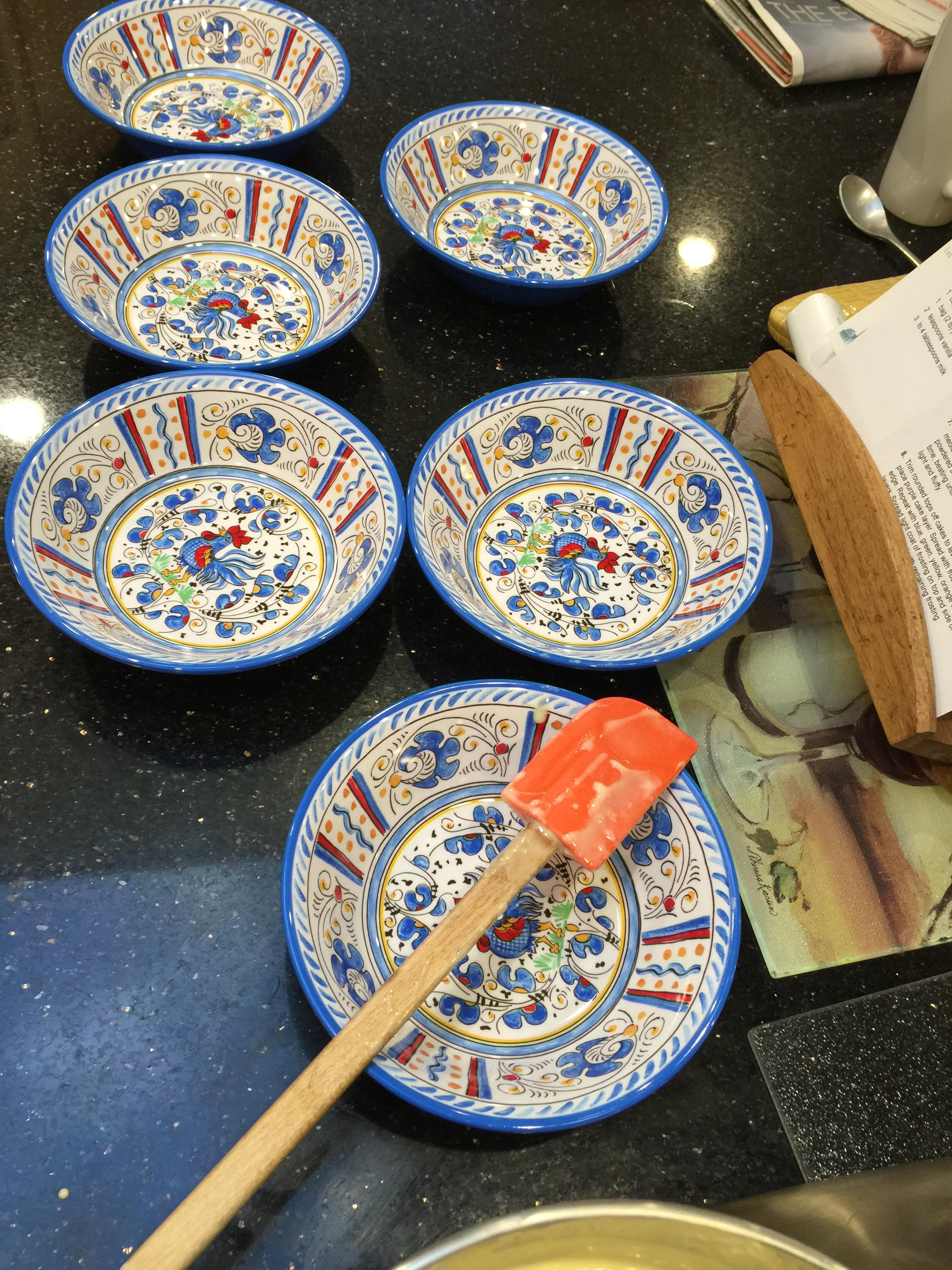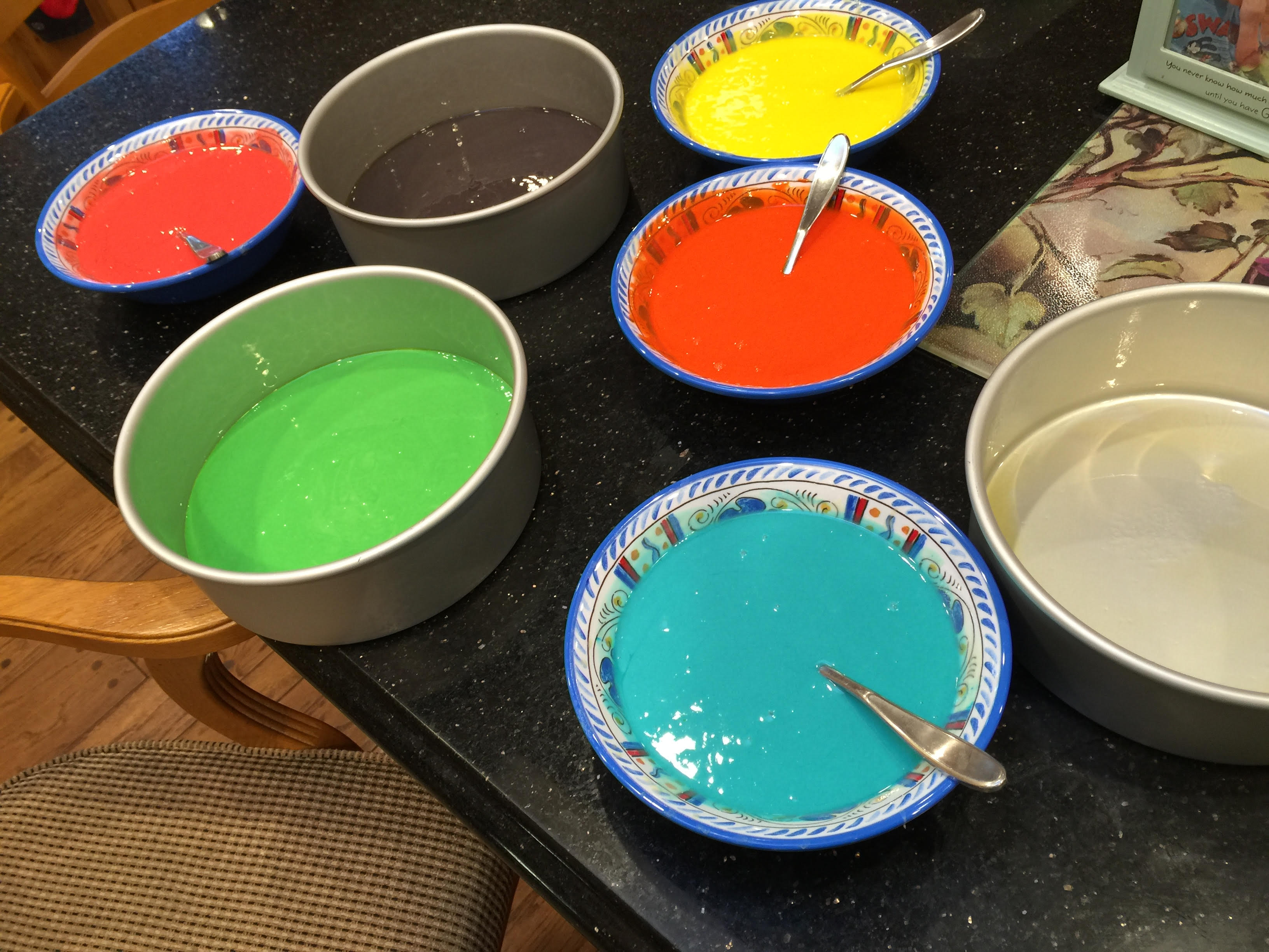 Plates for individual cake batter 2016 JOnah bdayJonah Rainbow cakes unfrosted 6 layers raw mix base color vanilla-2016 7th bdat