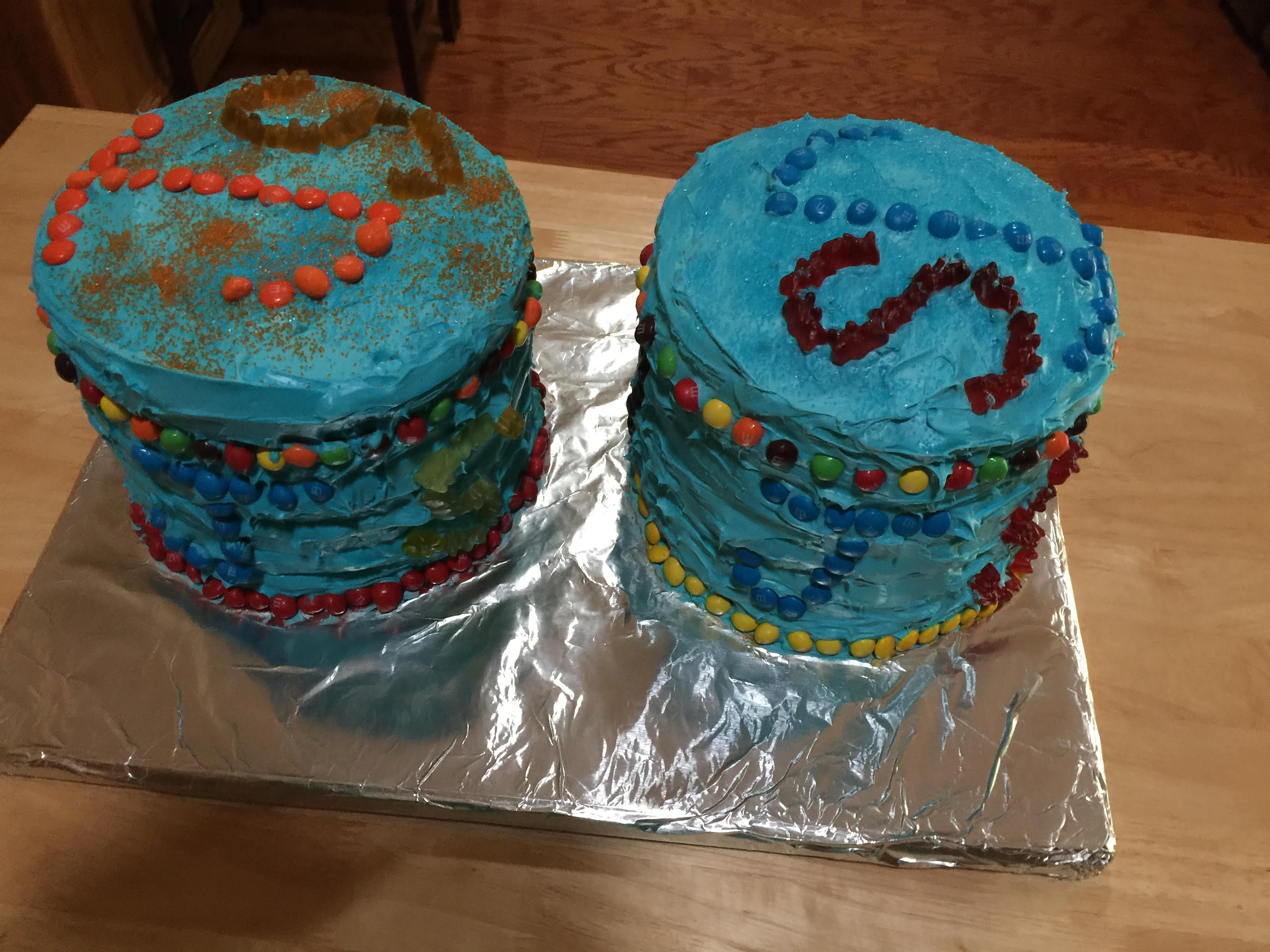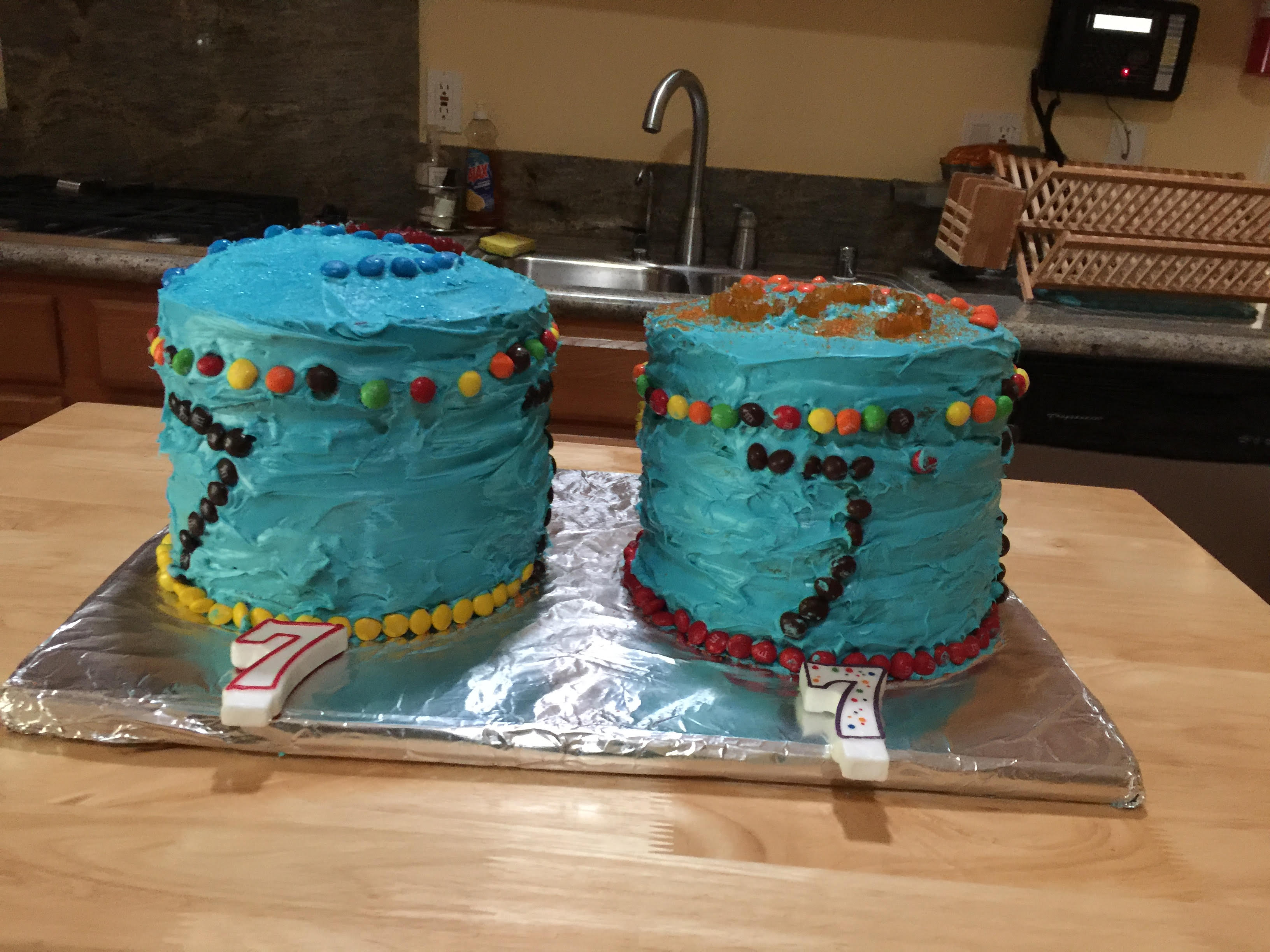 Our grandson Jonah is very particular in his tastes and he requested a 7th birthday cake in the colors of the rainbow with blue frosting and M&Ms – so I made one – and then realised that it was not going to be enough for 25 kids and 15 adults so I made another one!