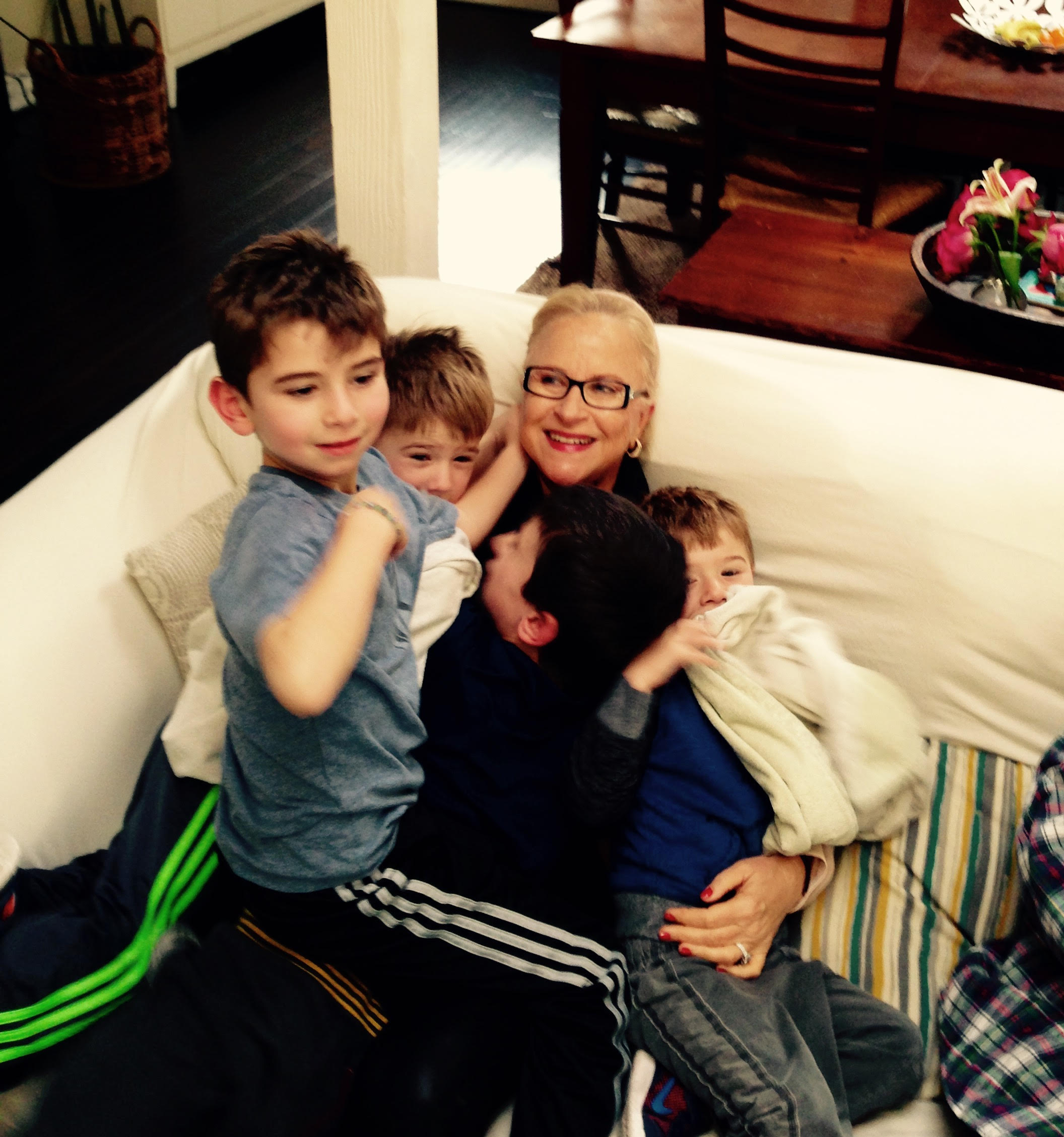 And four very happy grandsons with the happiest one of all – me – with a grandson sandwich! Jonah is the one in the grey shirt.