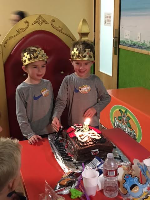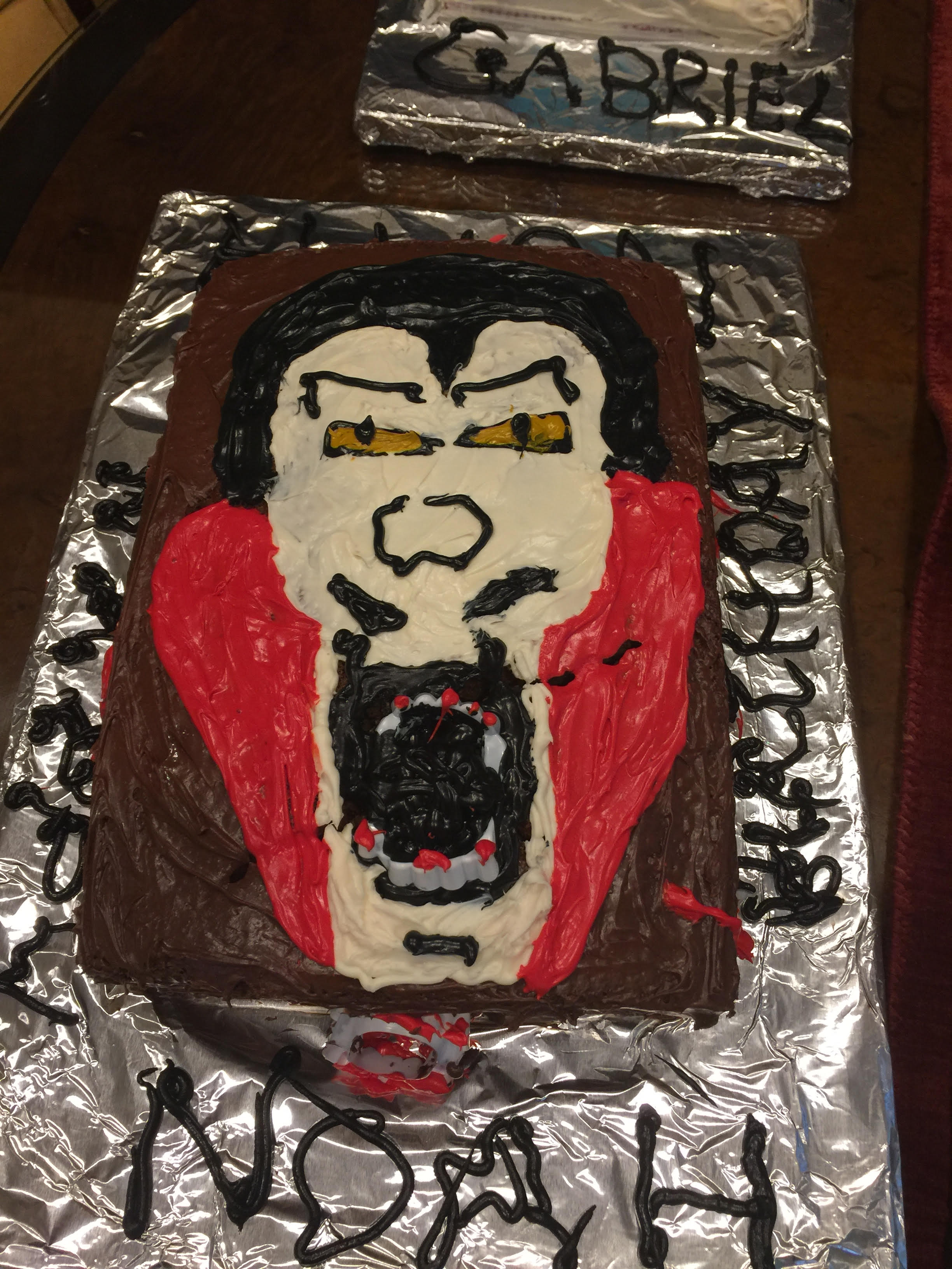This year was a challenging cake year! Noah was very specific – he wanted a vampire cake with teeth and a vampire figure on it – and blood! It had to be chocolate with chocolate frosting. Sigh. Then his twin Gabriel was also very specific. He wanted a lego man cake – yes in the shape of a lego man – with a lego character on the top and a lego truck. Sign. He wanted vanilla frosting but the cake had to be rainbow colors!