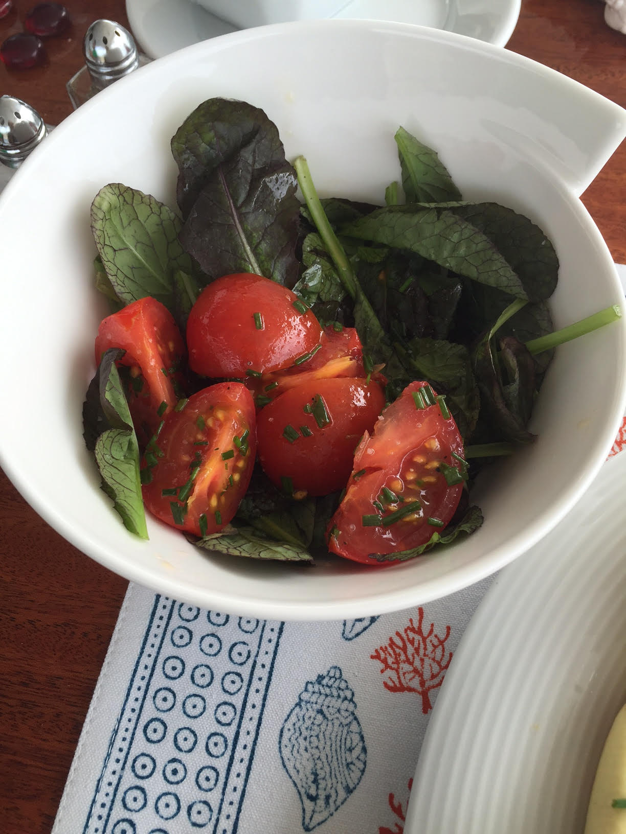 A simple tomato salad with mustard leaves and a light champagne vinaigrette dressing with chives – yum!TOmato and Mustard Leaf Salad on Kai